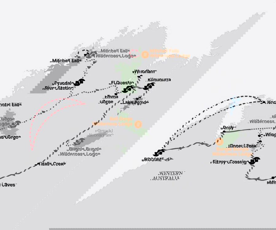 Back on the Gibb River Road, travel to Bell Gorge, where stunning cliffs surround a series of tiered waterholes. Sitting approximately 300 metres above sea level, Bell Gorge is an idyllic natural spot for swimming and photography. Here you can also enjoy a spot of birdwatching. If you are feeling particularly energetic, you can hike to the lower pool of the gorge and take a relaxing dip below the cascading waterfall. (B/L/D)