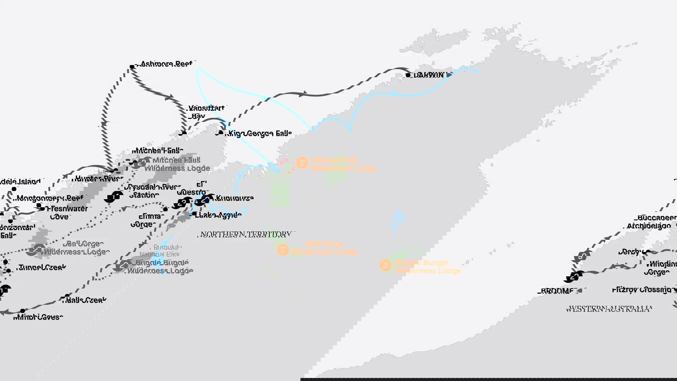 Cross the Drysdale River, then ascend the Mitchell Plateau to enter a remote world of Livistona palm forests, panoramic lookouts, magnificent waterfalls and isolated swimming holes.