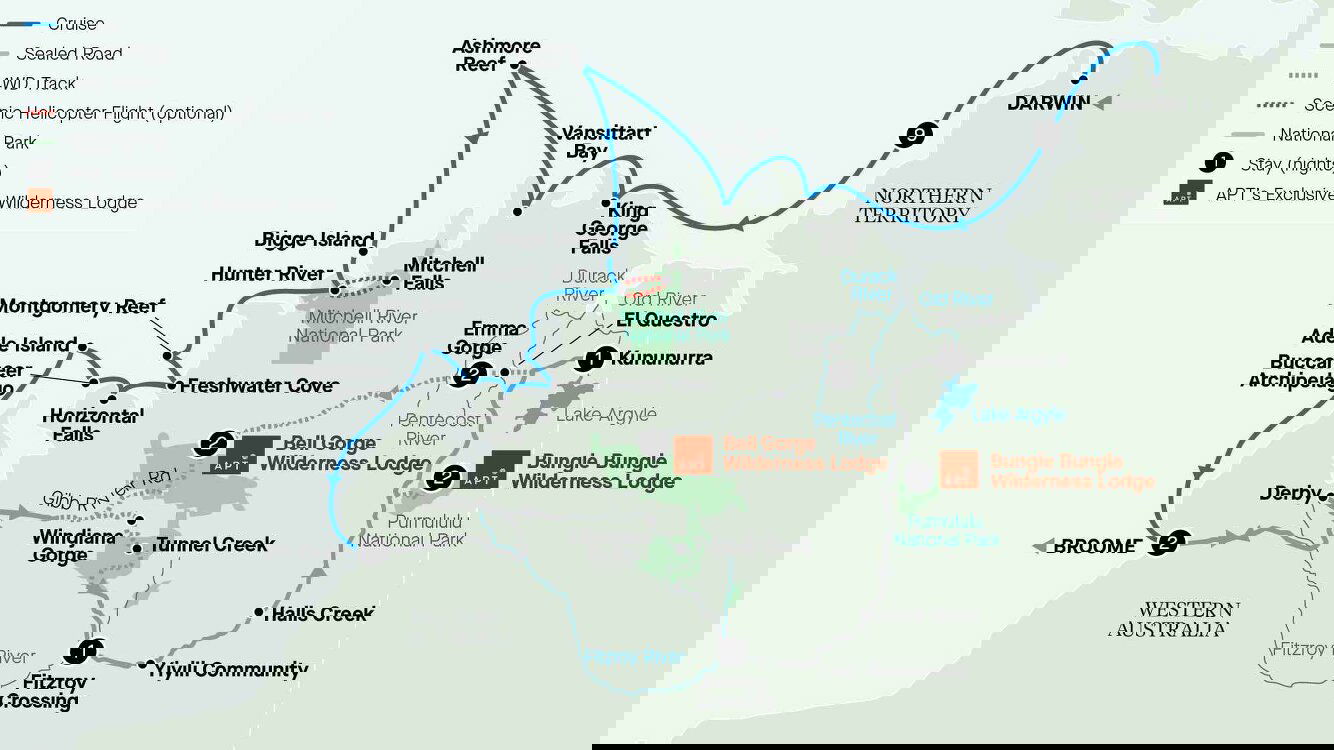 Keen birdwatchers should keep a careful eye out for kingfishers, egrets, herons and white-bellied sea eagles. To enhance your day, you might choose to set out on a thrilling helicopter flight to see the Mitchell Falls in all its splendour from above (flight at own expense). (B/L/D)