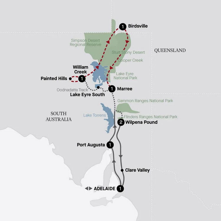This morning, explore the Historic railway town of Quorn, filled with charming heritage buildings that have been a backdrop for films including Gallipoli and Wolf Creek. Traverse the Pichi Richi Pass, a heritage steam railway line. Stop for lunch at Parachilna's famous Prairie Hotel, a family-owned pub that was first licensed in 1876. Continue to the stunning Aroona Dam and admire its spectacular ochre-coloured pits, then call in at the ghost town of Farina, once a thriving community with around 600 residents, before arriving at Marree. Stay: The Marree Hotel (B/L/D)