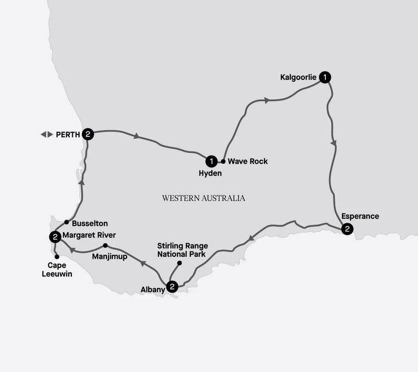Make the journey to Hyden today, home to Wave Rock. Over 2.7 billion years old, 15 metres high and running the length of over 100 metres, this striped granite rock formation appears like an ocean breaker frozen in time. A stone's throw from Wave Rock is Hippo's Yawn, a large rock formation that closely resembles a yawning hippo. Enjoy time to take photos of this intriguing landmark before continuing on to your accommodation for the night. Stay: Hyden, Wave Rock Hotel (B/L/D)