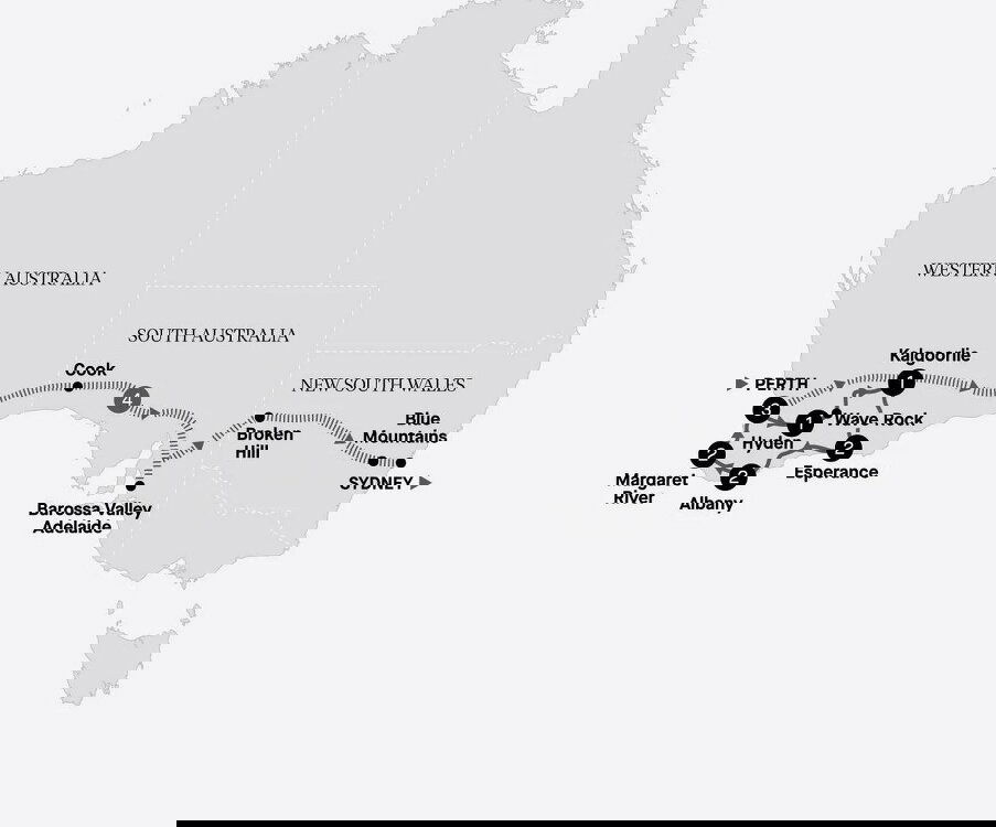 Make the journey to Hyden today, home to Wave Rock. Over 2.7 billion years old, 15 metres high and running the length of over 100 metres, this striped granite rock formation appears like an ocean breaker frozen in time. A stone's throw from Wave Rock is Hippo's Yawn, a large rock formation that closely resembles a yawning hippo. Enjoy time to take photos of this intriguing landmark before continuing on to your accommodation for the night. Stay: Hyden, Wave Rock Hotel (B/L/D)