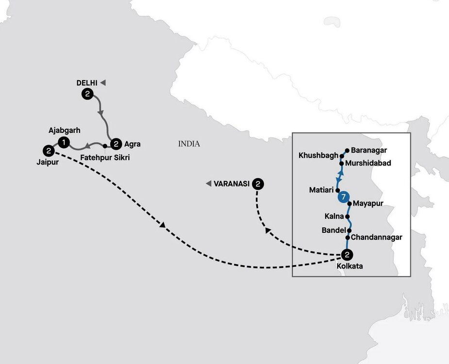 Enjoy a restful morning as life unfolds along the river before a visit to the village of Mayapur. Here you'll learn about the Hari Krishna community and culture in a meeting with some of the movement's dedicated followers. You'll also view the final stages of construction for the enormous Temple of the Vedic Planetarium - Mayapur Chandrodaya Mandir, the world headquarters of ISKCON. (B/L/D)