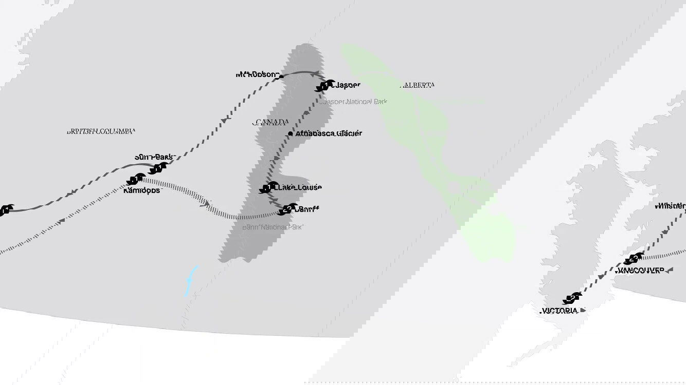 Take in Maligne Canyon before re-entering the province of British Columbia. Your journey follows the famous Yellowhead Highway. Pass Mount Robson, which is the highest peak in the Canadian Rockies, soaring at 3,954 metres above sea level. Later, arrive in the alpine village of Sun Peaks. Stay: Sun Peaks Grand Hotel (B/D)