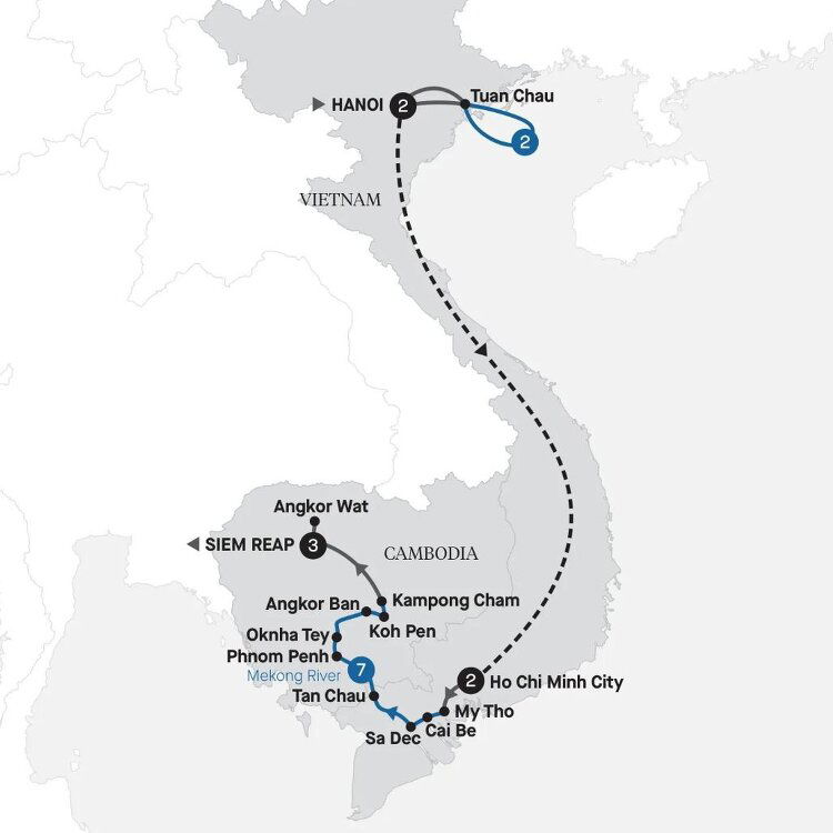 Choose your sightseeing this morning, then be transferred to your river ship. Set sail from My Tho and soak up the scenery during your cruise towards Cai Be. Tonight, a Vietnamese welcome dinner awaits, showcasing the diverse flavours from the region. Stay Seven Nights: Mekong River, Mekong Serenity (B/L/D)
