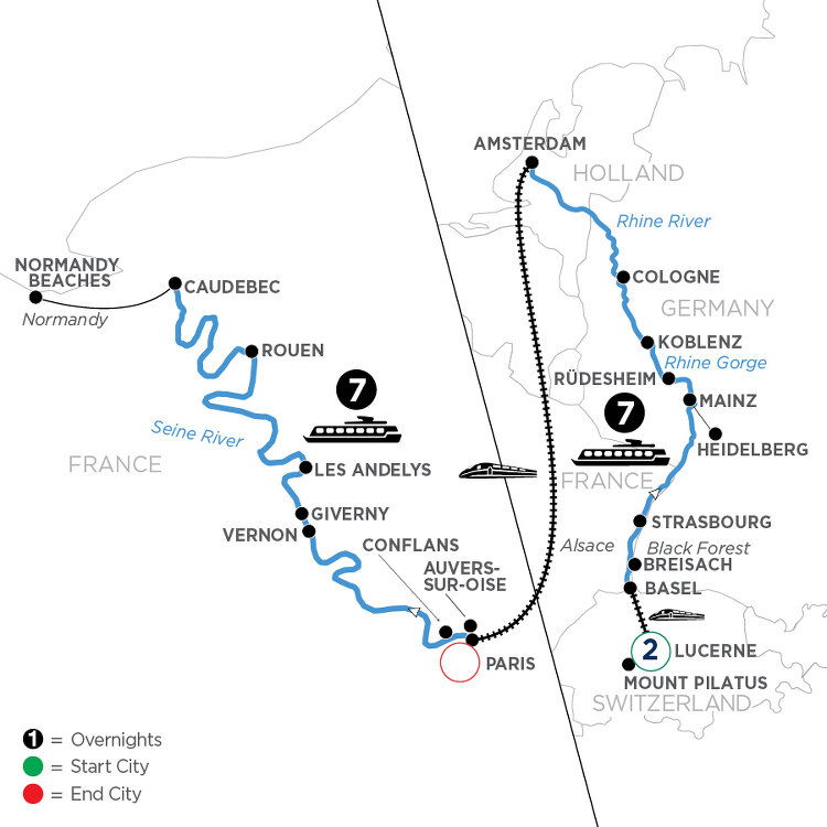 This morning, board a high - speed train for Paris to embark on your Avalon Suite Ship® and enjoy dinner onboard this evening.EVENING/OVERNIGHT CRUISE TO VERNON (B/D)