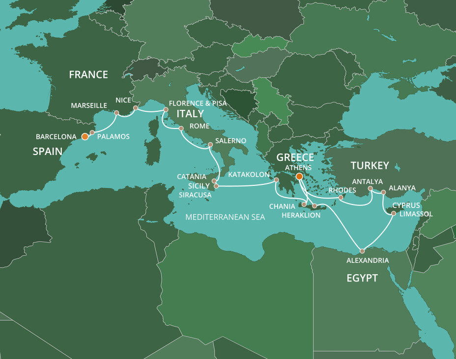 Between the Mediterranean Sea and Mount Etna lies the picturesque city of Catania. Destroyed by an earthquake in the 17th century, Catania has been beautifully restored and offers ancient churches, castles and amphitheaters, lush gardens and lovely palazzos to explore. Ships will dock at the cruise terminal.