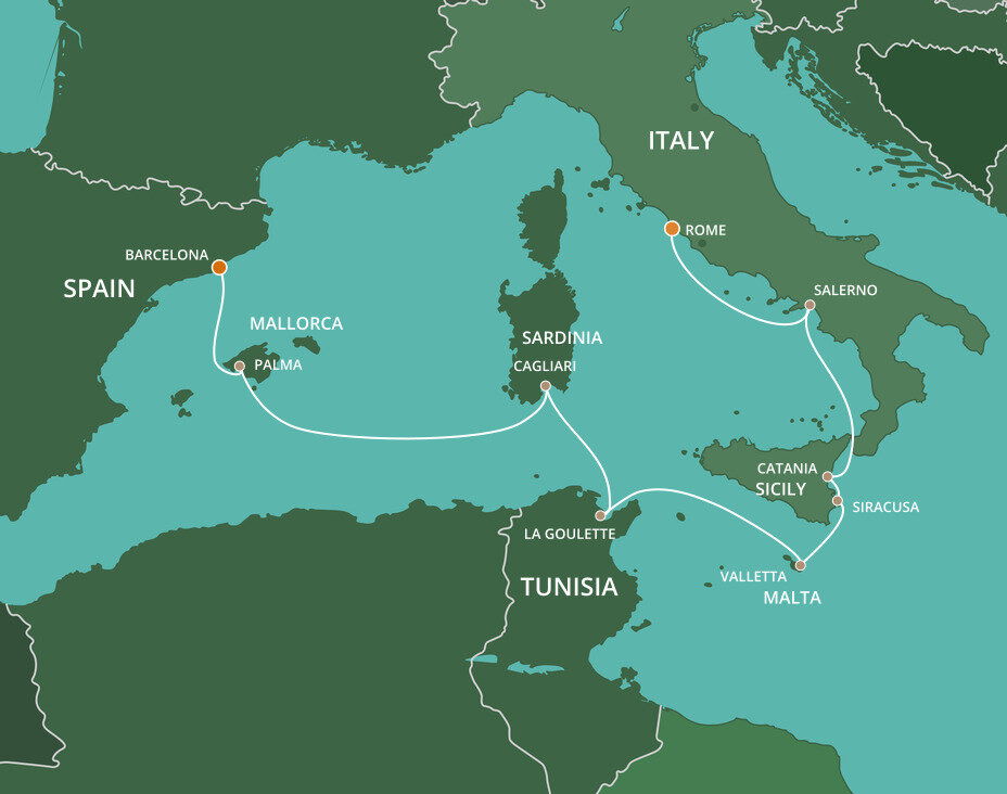 Between the Mediterranean Sea and Mount Etna lies the picturesque city of Catania. Destroyed by an earthquake in the 17th century, Catania has been beautifully restored and offers ancient churches, castles and amphitheaters, lush gardens and lovely palazzos to explore. Ships will dock at the cruise terminal.