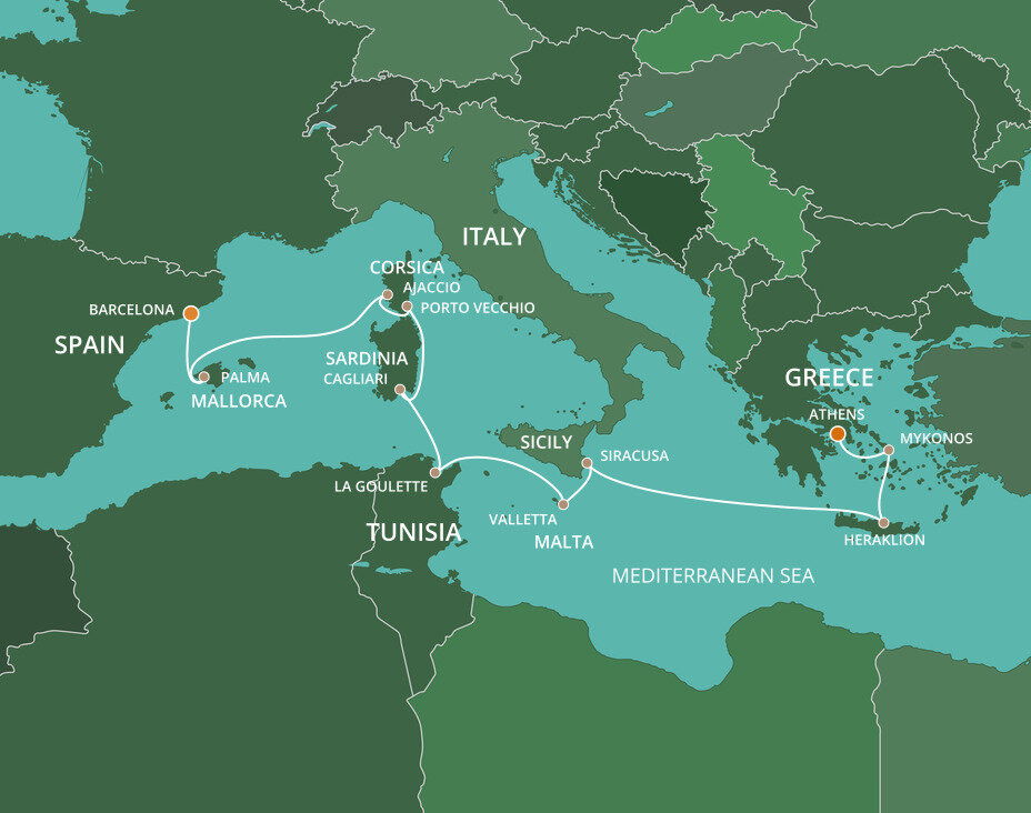 Cagliari, the capital of the island of Sardinia, is situated high upon hills that offer a panoramic view of the Golfo degli Angeli, the Gulf of Angels. Combining Byzantine churches with crumbling Roman ruins and Pisan towers, it’s an elegant, beguiling place to explore. Ships will dock at the Cagliari cruise port in Porto Cervo.