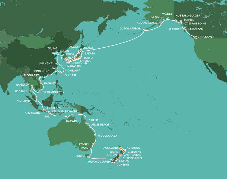 In downtown Auckland you can enjoy world-class dining, shopping, and sights. If you've a mind to explore, visit the island volcano of Rangitoto, or head to Waiheke, known as 'the island of wine' each are within a 40 minute ferry ride of your port.