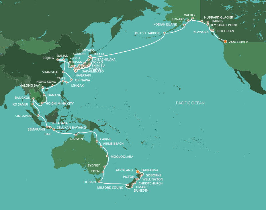 In downtown Auckland you can enjoy world-class dining, shopping, and sights. If you've a mind to explore, visit the island volcano of Rangitoto, or head to Waiheke, known as 'the island of wine' each are within a 40 minute ferry ride of your port.