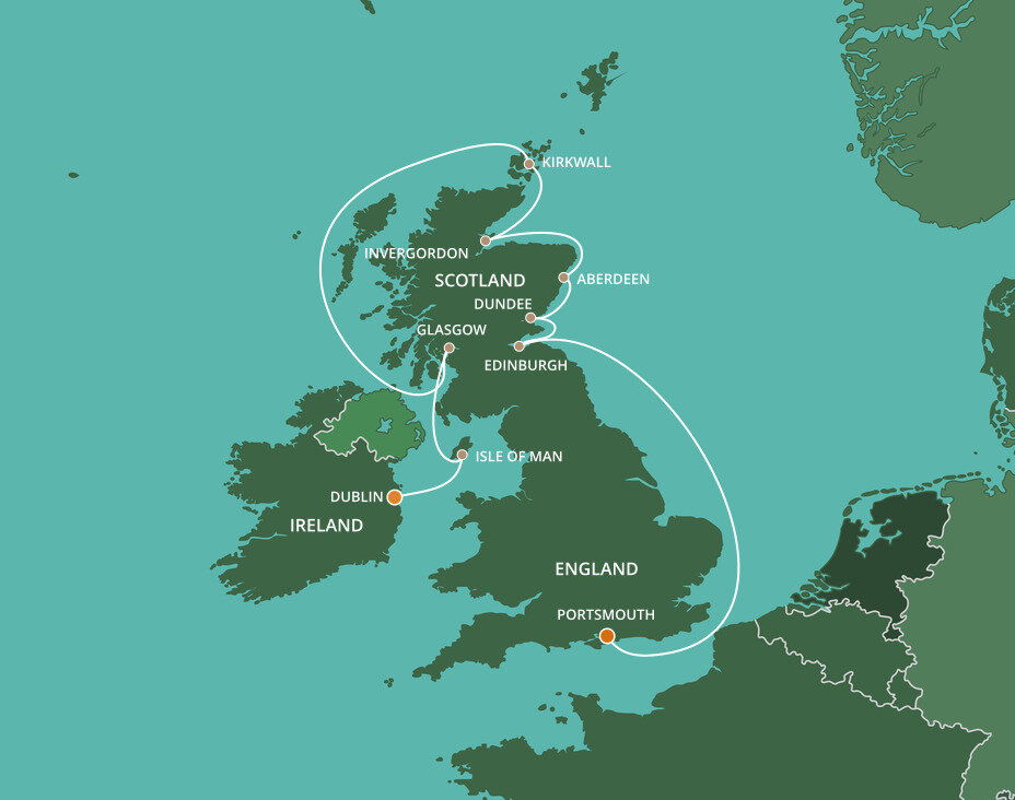 Nestled between the Highlands and the Border Hills, Edinburgh is a gracious city noted for its superb skyline, its impressive collection of architecture and its beautiful parks. Here you'll find the best of central eastern Scotland: spectacular views, rolling hills and castles. Ships will dock at the Port of Leith Cruise Liner Terminal.