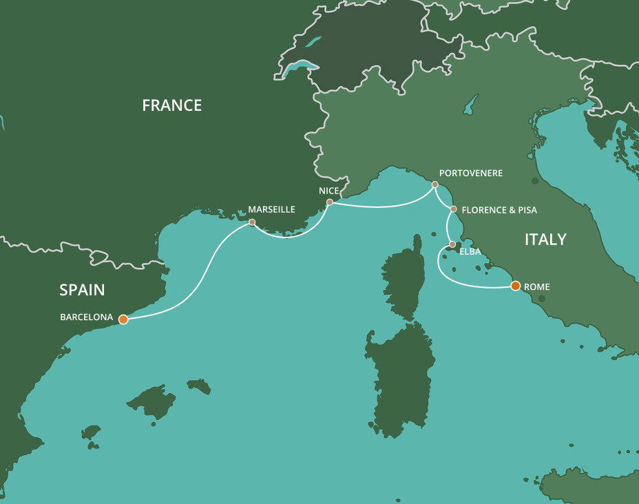 Portoferraio is the capital of the island of Elba, a mountainous mirage of glowing beaches, turquoise waters, and craggy coastline. The cities sun-faded pink and yellow buildings stack up over the waterfront, offering sweeping views back to the mainland. Ships will dock in the Portoferraio Marina.