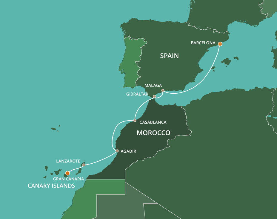 Tucked near the foot of the Atlas Mountains and surrounded by the rich plains of the Souss Valley, Agadir is a sunny cosmopolitan city with modern architecture, wide, tree-lined avenues and magnificent sandy beaches. Ships will dock at this port.