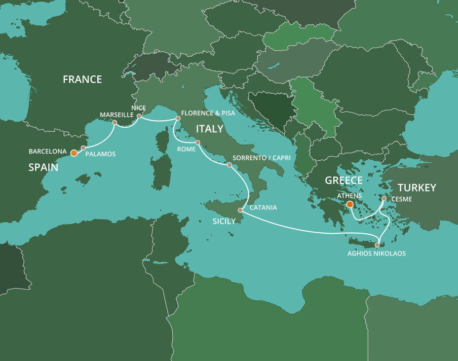 Set on the east of the Greek island Crete, Agios Nikolaos seamlessly blends the charm of a small fishing village with the glamour of a chic resort town. Pastel-coloured houses surround the towns pretty harbour and inky lake, while busy restaurants and cafes spill out onto its lively waterfront. Ships will dock at this port.