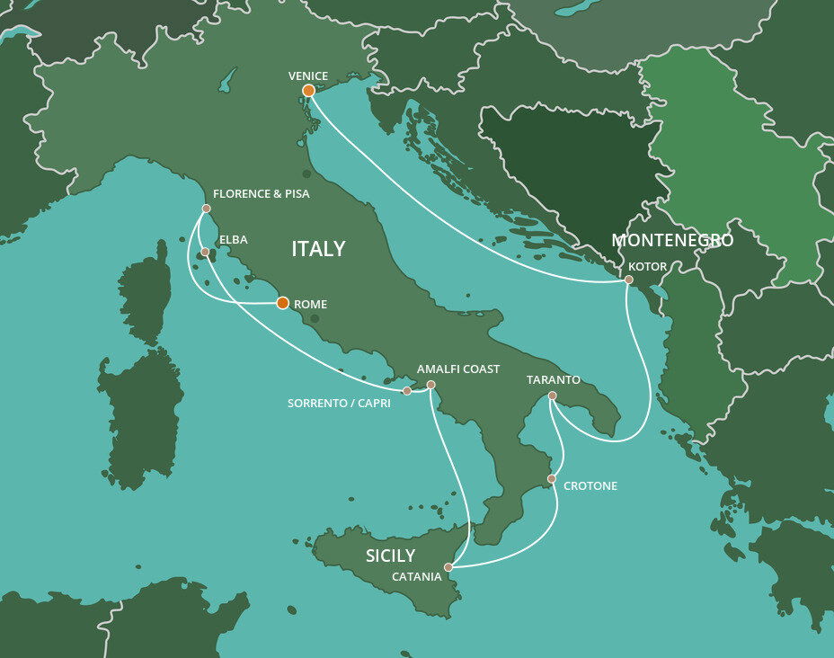 Tucked neatly under Italy’s heel, Taranto boasts a fascinating diversity of architectural styles due to the numerous invasions suffered by the city. A city of two distinct parts, the 'old city' is built on a small artificial island with a fascinating maze of narrow alleyways while the swankier 'new city' is replete with wide avenues. Ships will dock at the Port of Taranto.