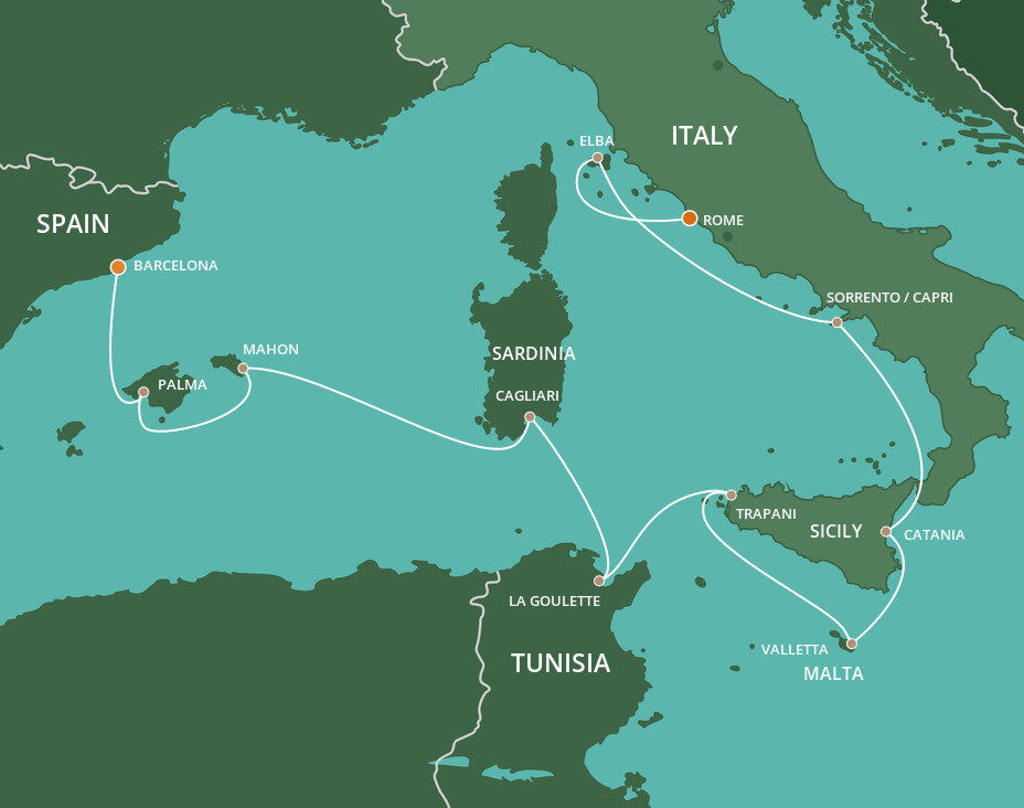 Perched on a low-lying, palazzi-dotted promontory on Sicily's west coast, Trapani reveals a hint of its medieval past in its historic core's maze of narrow streets. Surrounded by glowing turquoise waters and rugged coastline, it is the gateway to western Sicily's ruins. Ships will dock at Porto di Trapani.