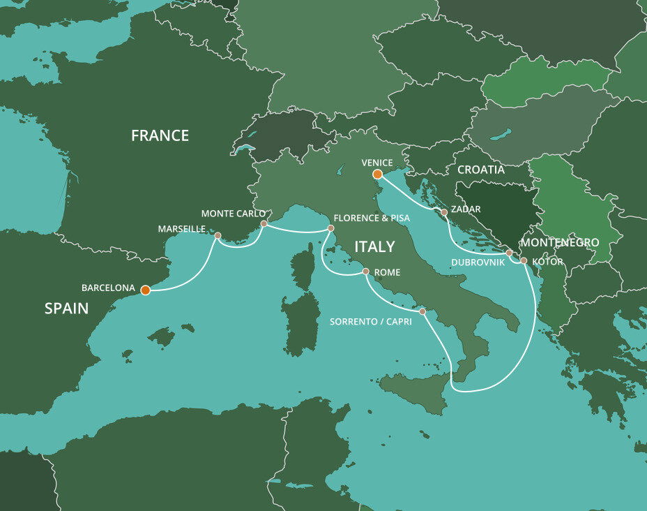 Sorrento's colourful, sun-faded facades cascade down from green hills and cliffs to the Bay of Naples. Looking out from Sorrento, in the Gulf of Naples, is the isle of Capri. Well known for its sparkling Blue Grotto and as the playground of the rich and famous. Ships will anchor offshore and tenders will be provided to the marina.
