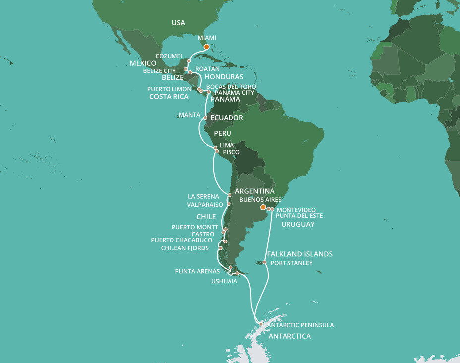 Located at the southernmost end of South America, Ushuaia is is often called a doorway to Antarctica. The town boasts incredible natural beauty through its national parks like the Tierra del Fuego National Park with cultural institutions like the Museo del Fin del Mundo, or the End of the World Museum. Ships will dock at this port.