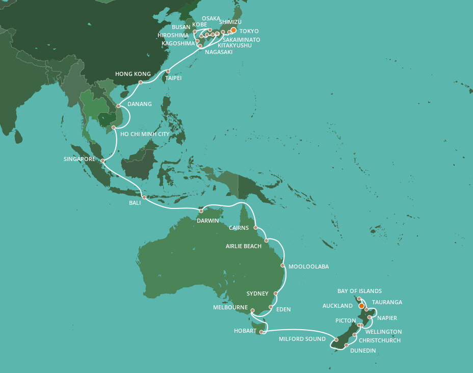 In downtown Auckland you can enjoy world-class dining, shopping, and sights. If you've a mind to explore, visit the island volcano of Rangitoto, or head to Waiheke, known as 'the island of wine' each are within a 40 minute ferry ride of your port.