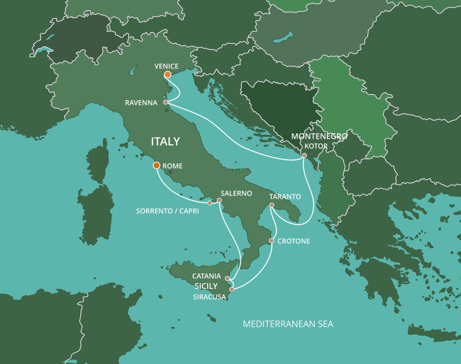 Tucked neatly under Italy’s heel, Taranto boasts a fascinating diversity of architectural styles due to the numerous invasions suffered by the city. A city of two distinct parts, the 'old city' is built on a small artificial island with a fascinating maze of narrow alleyways while the swankier 'new city' is replete with wide avenues. Ships will dock at the Port of Taranto.