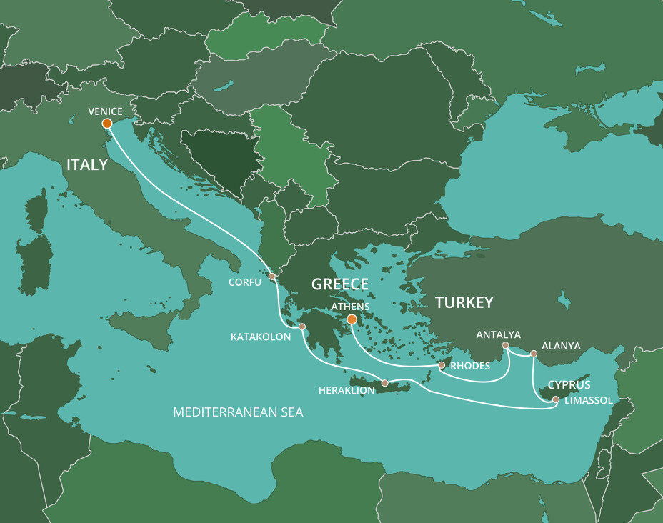 The vibrant city of Limassol is located on Akrotiri Bay in the shadow of the Troodos mountains. Its the jumping off point to explore the ancient riches of Cyprus. See ruins, majestic mountains and scenery, stunning beaches, and vast groves of lemons, oranges and olives. Ships will dock at the cruise terminal.