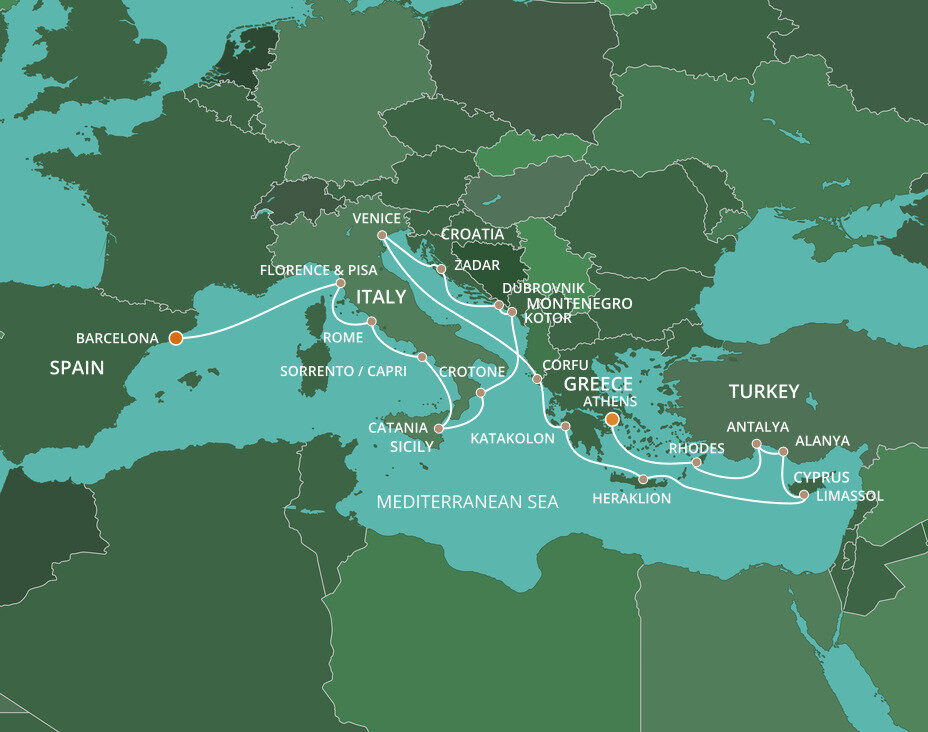 The lush and verdant island of Corfu lies in the Ionian Sea, midway between Greece and Italy. It is an island of sparkling beaches, mountains splashed with wildflowers, and historical, perched fortresses. Ships will dock at the town of Corfu.