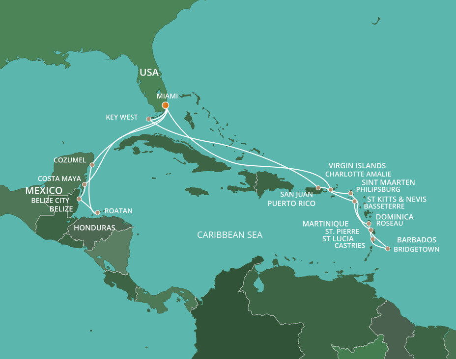 This multicultural city where the sun rules supreme is more than just a cruise port. Visitors from all over the world enjoy Miami’s famous Art Deco buildings, family-friendly zoos and romantic palm tree-lined streets filled with fantastic restaurants. Don’t forget about the white sandy beaches and year-round warm weather, perfect for relaxing before or after your Caribbean cruise from Miami.