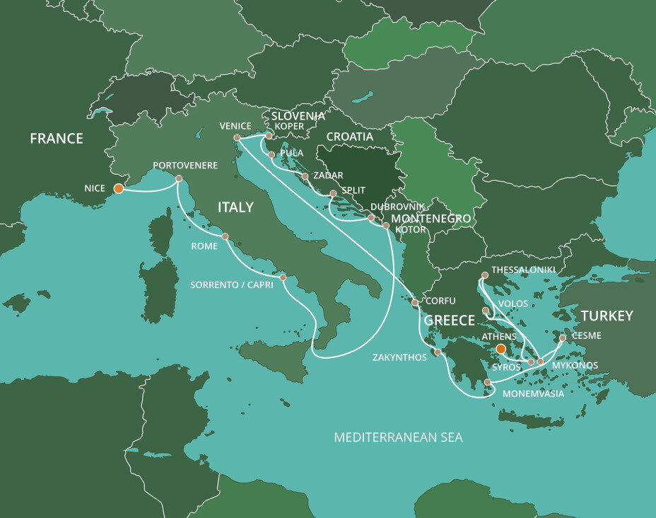 The lush and verdant island of Corfu lies in the Ionian Sea, midway between Greece and Italy. It is an island of sparkling beaches, mountains splashed with wildflowers, and historical, perched fortresses. Ships will dock at the town of Corfu.