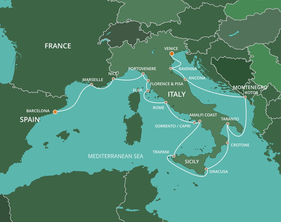 Perched on a low-lying, palazzi-dotted promontory on Sicily's west coast, Trapani reveals a hint of its medieval past in its historic core's maze of narrow streets. Surrounded by glowing turquoise waters and rugged coastline, it is the gateway to western Sicily's ruins. Ships will dock at Porto di Trapani.