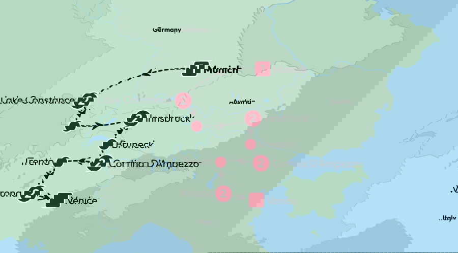 We'll head south towards Italy today, making a stop at Bruneck: an amalgamation of classic architecture within a vibrant atmosphere. Unearth its secrets at your leisure, taking in the colourful buildings, picturesque churches and local lifestyle. After finding delectable dishes to taste at lunchtime, we'll make our way to Cortina d'Ampezzo, Italy's most exclusive ski resort. This chapter of our journey begins with a visit to the Observatory of Helmut Ullrich which will open our eyes to the galaxy above us during a guided sun observation. Tonight, we'll share our favourite moments of the adventure so far over our included group dinner. Stay: Hotel Medil (or similar) (B/D)