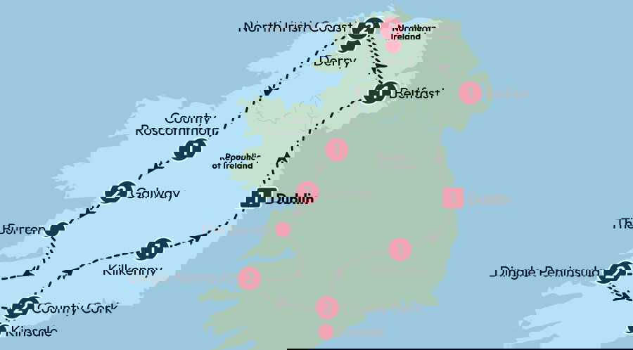 Then, it's up to you where your journey takes you. Saunter down Salthill Promenade in search of a plate of Galway's famous Atlantic oysters. Snag a table outside a colourful pub on Quay Street and treat your ears to some of Ireland's finest street tunes. Your path may even lead you to the plunging cliffs, windswept pastures and ancient stone settlements of the Aran Islands. All three are accessible via a guided tour from Doolin Harbour – just ask your Tour Leader to help you arrange it in advance. Stay: The Dean (or similar) (B)