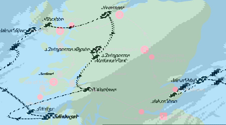 From one island to another, our adventure continues. Let's dive into the origins of Scottish Gaelic a little, giving you some food for thought as we pass through languid lochs, gleaming glens and magnificent Munros (mountains to us!). Irish settlers, known as Scoti, brought the language with them during the 4th or 5th century. From then, the language travelled through the land like a rush of water until the 16th century when it began to decline due to the immergence of English. Some words are preserved and many pockets of the population hope to revive Gaelic culture today. After a lunch stop in Mallaig (try to find some shortcakes to fill that spot!), our Tour Leader will share more stories and historic anecdotes alongside folklore and fairytales about the enchanted setting we find ourselves in until we settle in our new home for the next two nights: Mull. Stay: Western Isles Hotel (or similar) (B)