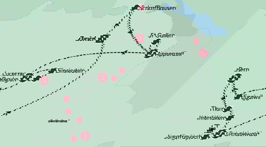 This morning, it's all aboard the mini-coach as we make tracks to our first stop: Schaffhausen. On an orientation tour with our expert Tour Leader, we'll explore the quaint Old Town located on the banks of the Rhine River. Afterwards, we'll have time to wander at our own pace and take lunch at a local cafe or restaurant. Then, we'll move on to our final destination of the day: Appenzell. Here, we'll enjoy a walking tour with a local guide and sample biberli (gingerbread pastries) – before having the rest of the evening free to explore the fairytale town and indulge in some delicious local fare. Stay: Hotel Löwen (or similar) (B)