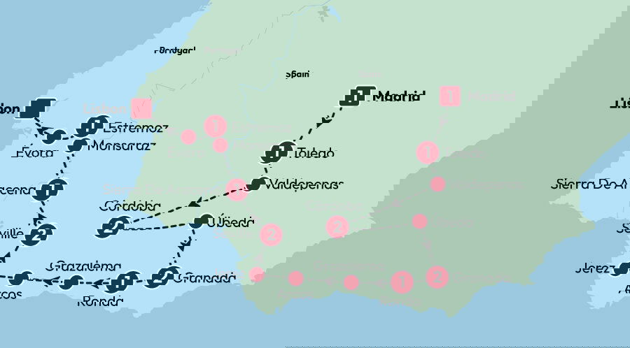 Ready to explore the Portuguese side of Iberia? After a lazy morning at our hotel, we'll get comfy in our luxury minicoach and continue our journey west – pausing for a quick café con leche just before the border in Rosal de le Frontera.