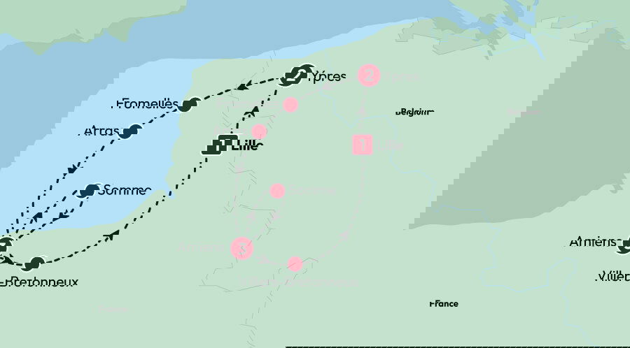 As the home of the National War Memorial, Villers-Bretonneux is central to Australian WWI commemoration and memory. Before we say our goodbyes today, we'll visit the Franco-Australian Museum – a site paying tribute to the brave Australian soldiers who helped to save the town and a monument to international solidarity. We'll make a brief stop at the Sir John Monash Centre before shifting our focus to the last year of the war – with a visit to Le Hamel. Our tour will conclude upon our return to Lille. (B)