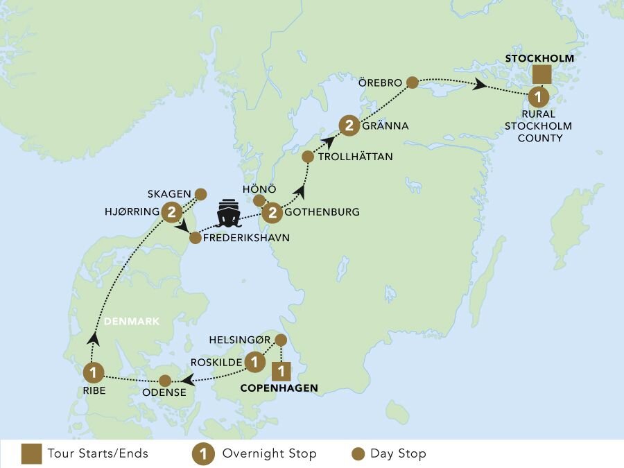 This morning, we'll take to the water by ferry, imagining the Vikings and their legendary ships from Day 2. Our journey won't be as treacherous as we make our way to Gothenburg – a city that basks in light by night and showcases its colourful buildings by day. Our Tour Leader will guide us through the Swedish city's streets, pointing out the 17th century structures which remain to this day alongside enchanting gardens filled with mesmerising colours and bewitching scents. The rest of the day is at your leisure. Stay: ProfilHotels Opera (or similar) (B)