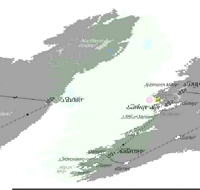 Your journey comes to an end after breakfast. Departure transfers arrive at Dublin airport. (B)