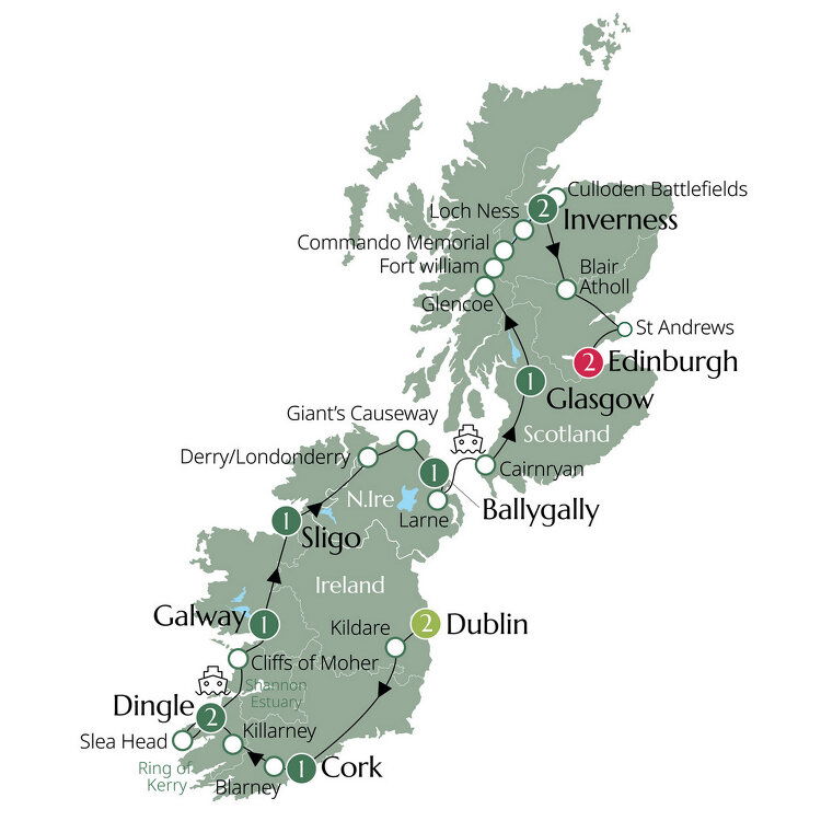 Your 14 days in Ireland and Scotland come to an end after breakfast with transfers arriving at Edinburgh airport. (B)