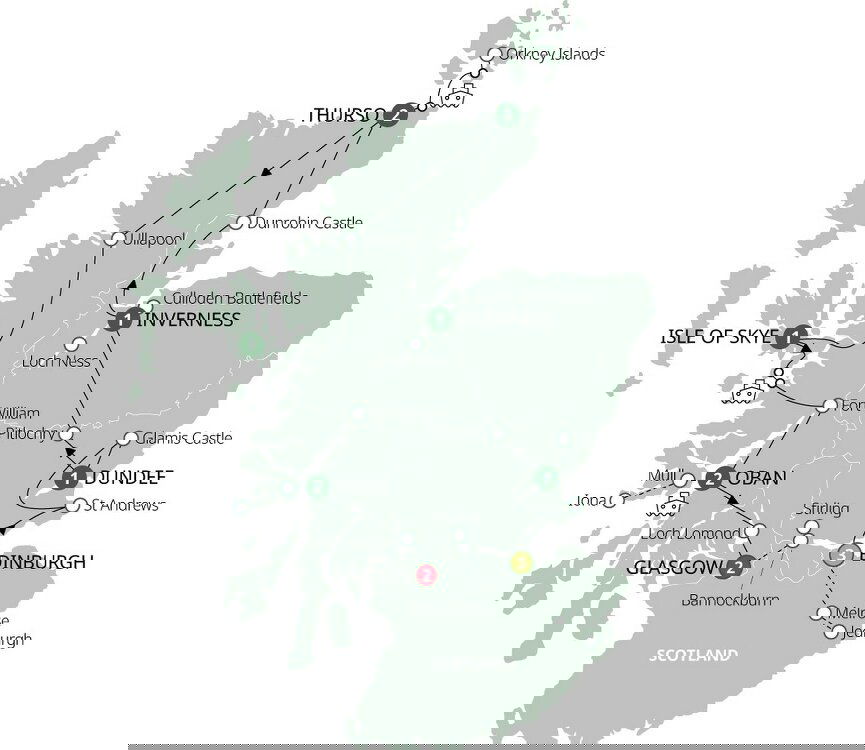 After stopping at John o' Groats, board a ferry to South Ronaldsay in the Orkney Islands. Visit the ornate Italian Chapel, built by Italian prisoners of war. See the prehistoric free-standing stones of the Ring of Brodgar before visiting Skara Brae and delving into the stories of the Neolithic village. Stop at beautiful Kirkwall Cathedral for a photo opportunity before returning to your hotel for dinner. (B/D)