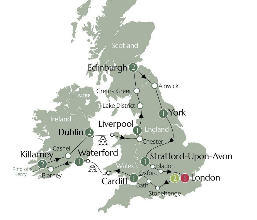 Ponder the mysteries of the ancient megaliths of Stonehenge, before driving west to Bath to visit the Roman Baths. Cross the Severn Estuary to Cardiff, then view the Wales Millennium Center and the National Assembly at Cardiff Bay. Later, enjoy warm hospitality and traditional Welsh meal and drinks at a rousing dinner. (B/D) Stay: Leonardo Hotel Cardiff