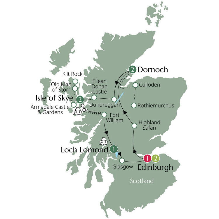 Today you'll visit Armadale Castle and Gardens and explore the ruins of the castle set among 40 acres of manicured grounds and sprawling woodlands. After, take in views of the Cuillin Mountains aboard the Isle of Skye ferry back to the mainland. Next, enjoy one of the most famous railway journeys in the world aboard the Jacobite Steam Train, known to Harry Potter fans as the Hogwarts Express. The track ebbs and flows through some of Scotland's most spectacular sights. After, head to your hotel on the shores of Loch Lomond. (B/D) Stay: Cameron House