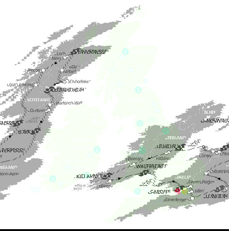 In the morning, travel along Loch Ness and hear tales of the famous Nessie. Continue your journey through some of the most stunning scenery in all of Scotland, found in the region of Glencoe. Reach the bonnie banks of Loch Lomond and admire the incredible scenery as you cruise what is arguably one of Scotland's most beautiful lochs, while enjoying a light lunch. Cross the English border before arriving at your lakeside hotel. (B/L/D) Stay: Castle Green, Kendal