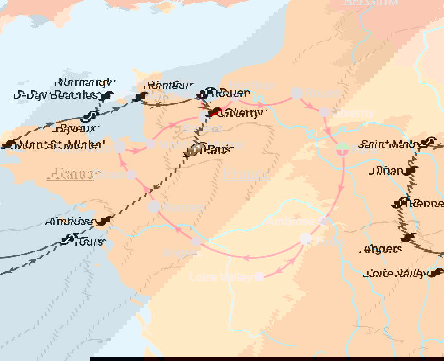 We begin at Colleville-sur-Mer (also known as Omaha Beach), where we will visit the Normandy American Cemetery and Memorial. We'll learn about the poignant events of World War II and pay our respects to those who served before continuing to Pointe du Hoc, a cliff that played an important role during the conflict. Continuing to Sainte Mere Église (also known as Utah Beach), we'll stop briefly to find some lunch.