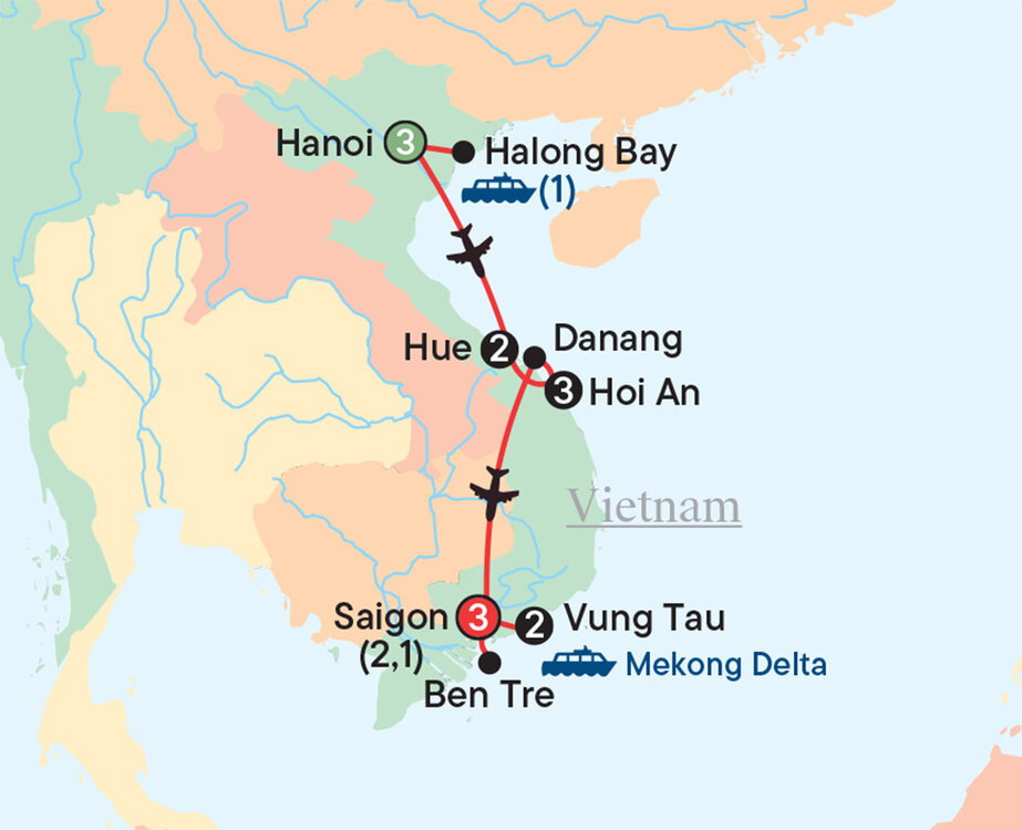 Optional Excursion: Ba Na Hills - Explore Ba Na Hills amusement park, board one of the world's longest non-stop single-track cable cars. Enjoy scenic views whilst floating over ancient rainforests and waterfalls up to the summit. Walk amongst the clouds along the iconic Golden Bridge, wander through the Le Jardin D’Amour Flower Garden and the French Village before descending the summit. 5 hours - from US $135pp (private including transfers).