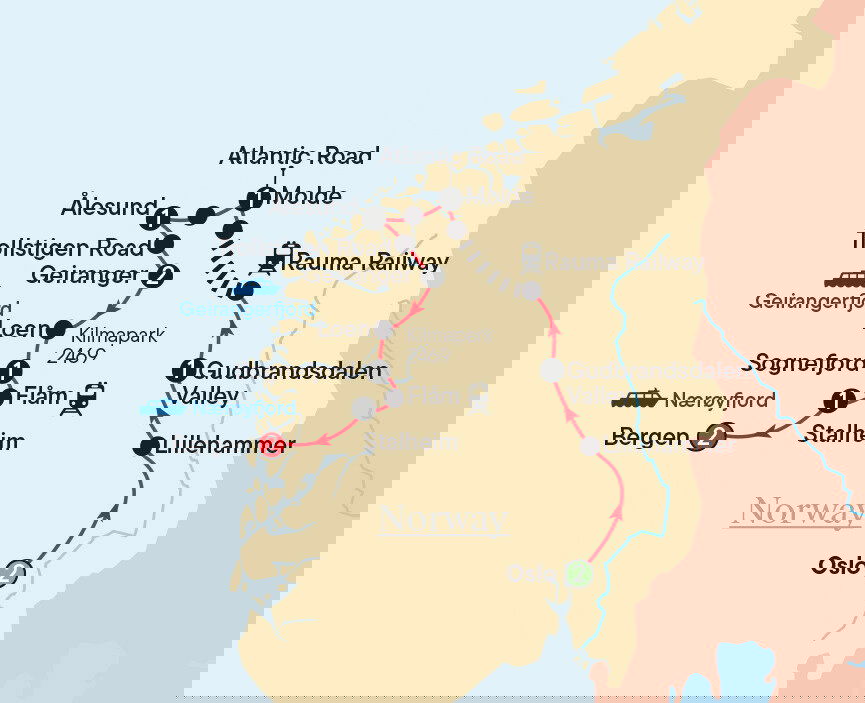 Special Experience: Board the Rauma Railway, one of Norway's most scenic train journeys, and marvel at the dramatic natural landscapes passing by. Named Europe's most beautiful railway line (and used as a backdrop for blockbusters like Harry Potter and Mission: Impossible), this train journey will put us front-row centre to Norway's postcard-perfect scenery. While we will not be crossing paths with Tom Cruise here, we will be left captivated by steep peaks, serene rivers and charming rustic villages. Snap photos of the iconic Kylling Bridge and watch waterfalls cascade from mighty cliffs as we sit back, soak up the rolling scenery and experience the joy of slow travel to Åndalsnes.