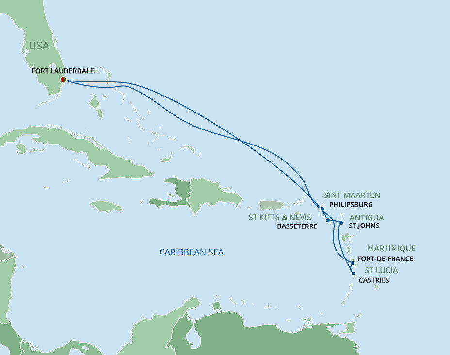 In the 1800s, William Lauderdale built a fort. Today, 16 million visitors come each year for miles of broad white sandy beaches, dozens of lush green golf courses, and Caribbean cruises from Fort Lauderdale. Stroll the famous beachfront promenade, just 15 minutes from the port, and plunge into the warm Atlantic. You’ll sail from Port Everglades. Fort Lauderdale-Hollywood International Airport is only a ten-minute drive from Port Everglades, and shuttle buses can take you from the airport to the cruise port. Free Wi-Fi and parking facilities are available at the port.