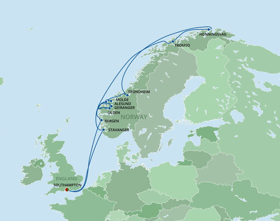 Known as the Town of Roses, Molde offers all of the stunning beauty associated with Norway. White clapboard houses sit alongside a sparkling fjord overlooking the city's famous panoramic view of 222 mountain peaks. Ships will dock at the Port of Molde & Romsdal.