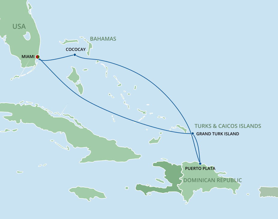 Beach masterpieces of silky white sand and sparkling water shifting from turquoise to royal blue welcome you to idyllic Grand Turk. The capital of the Turks and Caicos Islands is a small island bursting with turn-of-the-century charm, retaining the look and feel of the Caribbean 40 years ago. Ships will dock at the Grand Turk Cruise Centre.