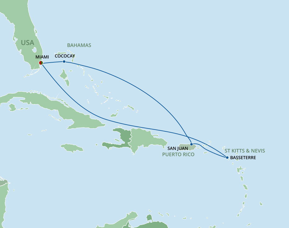 This multicultural city where the sun rules supreme is more than just a cruise port. Palm-lined causeways stretch across luminous Biscayne Bay as Miami rises in a gleam of glass towers, Art Deco curves, and tropical colour. Along Ocean Drive in South Beach, pastel facades from the 1930s glow beneath the Florida sun, while nearby Little Havana hums with domino parks, cigar shops, and the aroma of Cuban coffee. Beyond the shoreline, calm waters, yacht marinas, and breezy promenades frame a city shaped by Caribbean rhythms and sunlit coastal glamour.